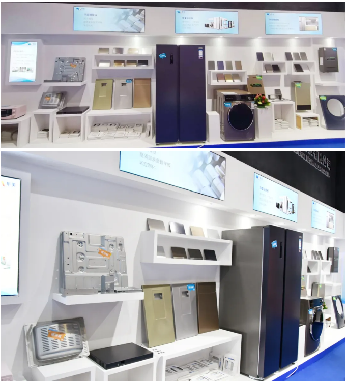 參展的家電領域產品有:家電鍍鋅薄板、彩涂板、覆膜板,產品應用于家電產品的面板、側板、背板等。本次參展將品牌家電與華美科技的產品樣片相結合展示,更好的詮釋了華美科技“樂享未來華美生活”這一使命。